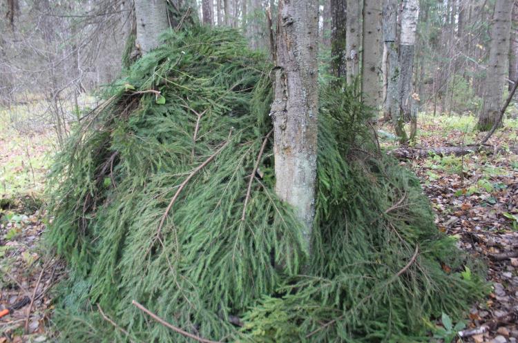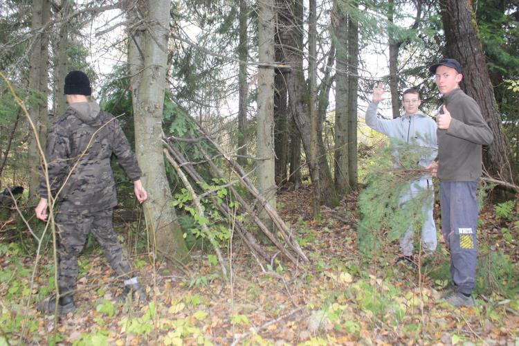 Ребята отработали учебный вопрос «временные укрытия типа «навес» и «шалаш». По легенде их команда оказалась в лесу без привычных палаток. Добравшись до намеченной точки, три группы курсантов получили задание: за 20 минут соорудить себе кров из того, что найдется под рукой. После того, как время вышло, участники оценили работу друг друга. Победителем стала команда, в арсенале которой оказался топор – он значительно облегчил процесс строительства.