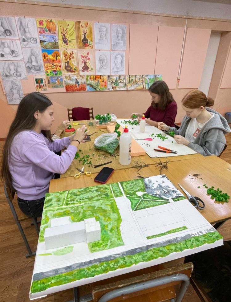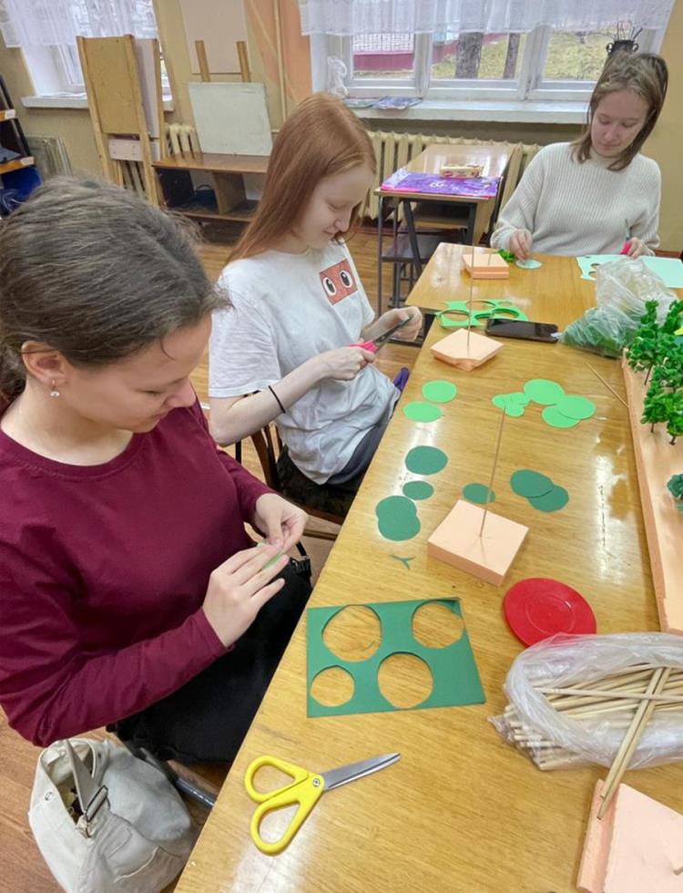 Ребята познакомились с принципами макетирования. Под руководством наставника, преподавателя Натальи Бурдиной научились своими руками создавать деревья из бумаги, поролона и веток.
