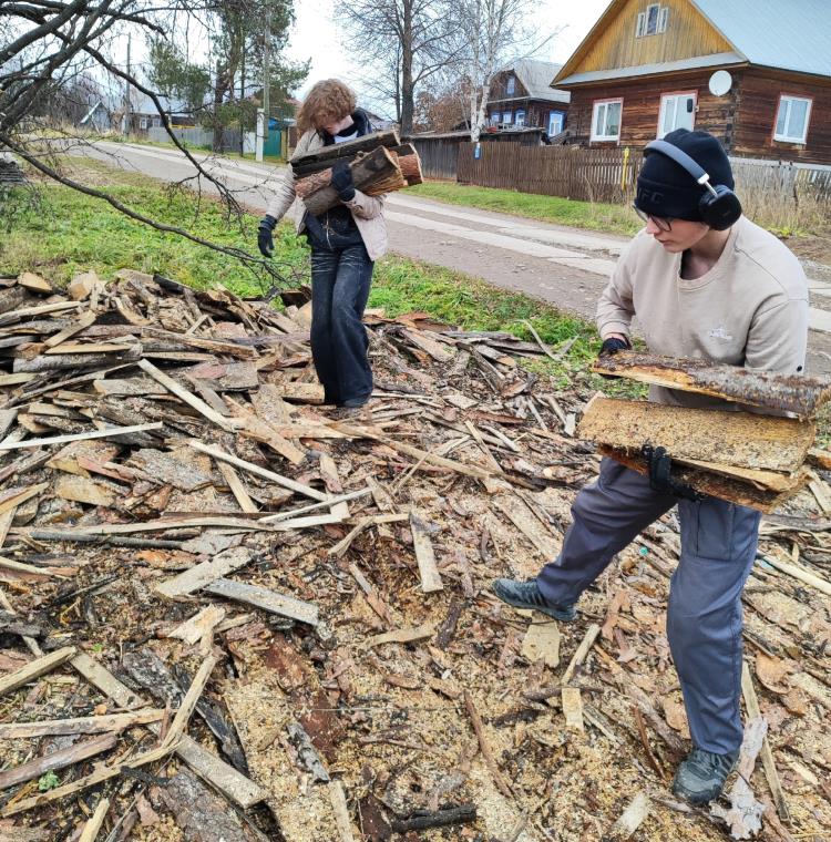 Молодые люди оказали важную помощь - ребята сложили дрова в поленницу.
